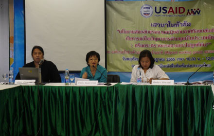 เครือข่ายองค์กรด้านประชากรข้ามชาติ (Migrant working group) และองค์กรภาคีเครือข่าย จัดงานเสวนา “เรื่อง นโยบายส่งกลังแรงงานหญิงข้ามชาติท้องกลับประเทศ กับการแก้ไขปัญหาการค้ามนุษย์ในประเทศไทย : หรือกระทรวงแรงงานเกาไม่ถูกที่คัน” ณ สมาคมนักข่าวนักหนังสือพิมพ์แห่งประเทศไทย โดยมี นางสาวทัตติยา ลิขิตวงษ์ ผู้ช่วยผู้จัดการมูลนิธิเพื่อการพัฒนาเด็ก(มพด.) นายอดิศร เกิดมงคล ตัวแทนเครือข่ายองค์กรด้านประชากรข้ามชาติ และ นางสาวทัศนัย ขันตยาภรณ์ ตัวแทนจากองค์การพัฒนาเทคโนโลยีเพื่อการสาธารณสุข (PATH) ร่วมเสวนา
