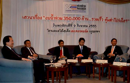 เมื่อเร็วๆ นี้ ภาคีเครือข่ายต่อต้านคอร์รัปชั่น (ภคต.) จัดเสวนา "งบน้ำท่วม 350,000 ล้านบาท...รวดเร็ว คุ้มค่า โปร่งใส" ณ ห้องบุษบา โรงแรมสวิสโฮเทล เลอคองคอร์ด โดยมี นายประมณฑ์ สุธีวงศ์ ประธาน ภคต. กล่าวเปิดงาน นายสุพจน์ โตวิจักรณ์ชัยกุล รองปลัดกระทรวงทรัพยากรธรรมชาติและสิ่งแวดล้อม รศ.ดร.ต่อตระกูล ยมนาค ประธานกลุ่มวิศวกรเพื่อชาติ รศ.ดร.เสรี ศุภราทิตย์ ศูนย์การเปลี่ยนแปลงภูมิอากาศและภัยพิบัติ ม.รังสิต และกรรมการยุทธศาสตร์เพื่อวางระบบการบริหารจัดการทรัพยากรน้ำ (กยน.) ร่วมเสวนา