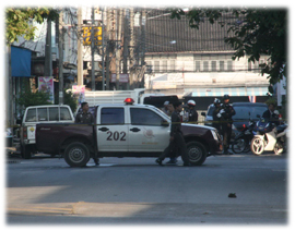 3 ตำรวจนำกำลังปิดถนนในเขตเทศบาลนครยะลาเพื่อเก็บกู้วัตถุระเบิดแบบ เอ็ม 67 ที่ผู้ต้องสงสัยทำหล่นเอาไว้ (ภาพทั้งหมดโดย อะหมัด รามันห์สิริวงศ์)