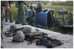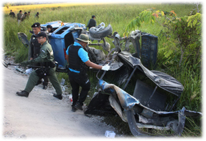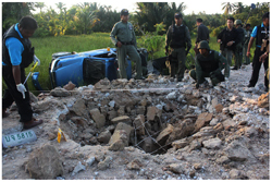 1-4 สภาพรถกระบะของเจ้าหน้าที่ทหาร และขนาดของหลุ่มระเบิดบนถนน จากเหตุการณ์คนร้ายจุดชนวนระเบิดดักสังหารทหารชุดลาดตระเวนในท้องที่ ต.จะกว๊ะ อ.รามัน จ.ยะลา เมื่อวันศุกร์ที่ 22 เม.ย.ที่ผ่านมา