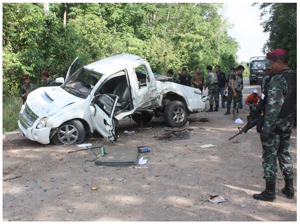 บรรยายภาพ : สภาพรถกระบะหุ้มเกราะของทหารชุดลาดตระเวนซึ่งถูกคนร้ายลอบวางระเบิดที่ อ.รามัน จ.ยะลา ทำให้กำลังพลเสียชีวิตถึง 3 นาย