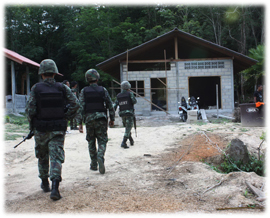 2 เจ้าหน้าที่ทหารนำกำลังเข้าตรวจค้นบ้านที่นายมานะ มะละซอ ผู้ต้องหาคดียาเสพติดใช้กบดาน ในท้องที่ ต.ละแอ อ.ยะหา หลังนายมานะเสียชีวิตจากการถูกวิสามัญฆาตกรรม