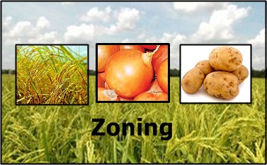 โดยมีพืชนำร่องในการจัดโซนนิ่ง 3 ชนิด ได้แก่ ข้าว หอมหัวใหญ่ และมันฝรั่ง ซึ่งมีแนวทางดังนี้ 1.ข้าว แบ่งโซนนิ่งแยกตามประเภทของข้าว อาทิ ข้าวเพื่อการส่งออก ข้าวเพื่อบริโภค ข้าวพันธุ์พื้นเมืองที่สงวนพันธุ์ เพื่อมีพื้นที่การปลูกข้าวที่เป็นสัดส่วน สามารถดูดูแลพัฒนาพันธุ์และการผลิตได้ เช่น พื้นที่ทุ่งกุลาร้องไห้ อาจเป็นโซนปลูกข้าวหอมมะลิคุณภาพเพื่อการส่งออกเป็นหลัก 2. หอมหัวใหญ่ จำกัดการนำเข้าเมล็ดพันธุ์เพื่อจำกัดปริมาณการผลิต แก้ปัญหาหอมล้นตลาด ควบคุมราคาให้อยู่ในระดับที่น่าพอใจได้ และ3.มันฝรั่ง ซึ่งเป็นสินค้าที่ไม่ค่อยมีการบริโภคโดยตรง โดยจะสนับสนุนการจับคู่สัญญาการค้าระหว่างผู้ผลิตและโรงงานในพื้นที่โซนนิ่ง ให้ผู้ผลิตมีตลาดโรงงานที่รองรับแน่นอนและขายสินค้าได้ในราคาที่พอใจ