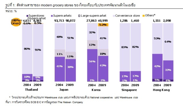 ธุรกิจค้าปลีก grocery store ของไทยมีแนวโน้มเติบโตไปตามประเทศพัฒนาแล้วในเอเชีย โดยจะมุ่งไปที่โมเดลขนาดเล็กลง หากดูจากโครงสร้าง grocery store ของประเทศพัฒนาแล้วในเอเชียคือ ญี่ปุ่น ฮ่องกง สิงคโปร์และเกาหลีจะพบว่ายอดขายของซุปเปอร์มาร์เก็ตมีสัดส่วนสูงที่สุดเกินกว่า 50% ของยอดค้าปลีกสมัยใหม่ โดยที่สัดส่วนของสาขายังกระจุกตัวอยู่ที่ซุปเปอร์มาร์เก็ตและร้านสะดวกซื้อ ขณะที่ร้านค้าปลีกขนาดใหญ่อย่างซุปเปอร์สโตร์ไม่เป็นที่นิยมมากนัก โดยเฉพาะในญี่ปุ่น ต่างจากไทยซึ่งแม้จะมีสัดส่วนจำนวนสาขาของร้านสะดวกซื้อมากที่สุด (รูปที่1) แต่กลับมียอดขายของซุปเปอร์สโตร์สูงที่สุด อย่างไรก็ดี จะพบว่าจำนวนสาขาของซุปเปอร์สโตร์เติบโตช้าลงอย่างเห็นได้ชัด จากเดิมในช่วงปี 2004-2008 สาขาเพิ่มขึ้นราว 20% ต่อปี มาในปี 2009-2011 เพิ่มขึ้นเพียงราว 7% ต่อปี เช่นเดียวกับยอดขายที่เติบโตช้าลงจาก 17% ต่อปีเป็น 4% ต่อปีในช่วงเวลาเดียวกัน ขณะที่ร้านสะดวกซื้อมีบทบาทมากขึ้นเห็นได้จากจำนวนสาขาที่เติบโตสูงราว 14% ต่อปีและมียอดขายที่เติบโตถึง 16% ในช่วง 2006-2011 สะท้อนว่า grocery store ของไทยมีแนวโน้มพัฒนาไปเป็นโมเดลที่เล็กลง