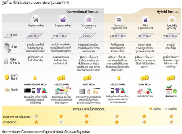 Grocery store ของไทยยังมีศักยภาพเติบโตได้อีกมาก แต่การเติบโตของสาขาจะเน้นไปที่โมเดลขนาด เล็กลง และจับตามอง “hybrid concept” ซึ่งเป็นการผสมผสานรูปแบบต่างๆ ซึ่งจะแตกต่างไปตามทำเลและกลุ่มลูกค้าเป้าหมาย