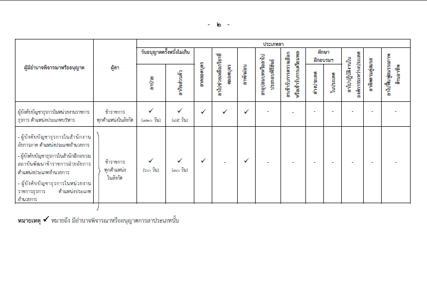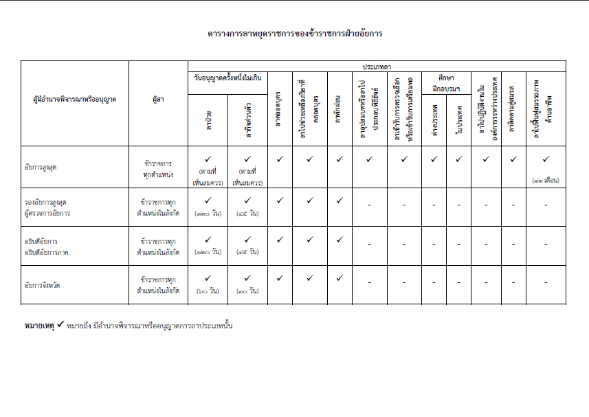 โดยมีการกำหนดประเภทและผู้มีอำนาจอนุมัติการลาของข้าราชการอัยการ เป็นไปตามตารางด้านล่าง