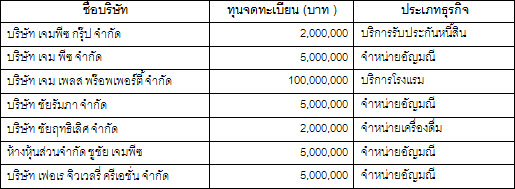 ธุรกิจค้าเครื่องดื่ม 1 บริษัท คือ บริษัท ชัยฤทธิเลิศ จำกัด และ รับประกันหนี้สิน 1 บริษัท คือ บริษัท เจมพีซ กรุ๊ป จำกัด