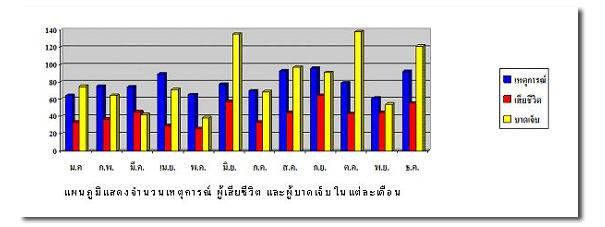 ในส่วนของจำนวนเหตุการณ์ ผู้เสียชีวิต และผู้ได้รับบาดเจ็บ แยกเป็นข้อมูลรายเดือนได้ดังนี้