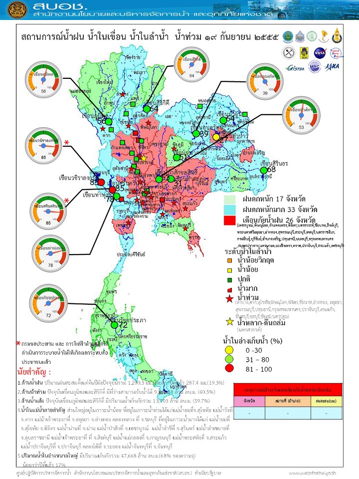 ศูนย์ประมวลวิเคราะห์สถานการณ์น้ำ กรมชลประทาน รายงานสถานการณ์น้ำในแม่น้ำเจ้าพระยา ล่าสุด ณ เวลา 10.00 น. (19 ก.ย. 55) มีปริมาณน้ำไหลผ่านที่สถานี C.2 อ.เมืองนครสวรรค์ 1,739 ลูกบาศก์เมตรต่อวินาที (รับน้ำได้สูงสุด 3,590 ลูกบาศก์เมตรต่อวินาที) ระดับน้ำต่ำกว่าตลิ่ง 3.08 เมตร ลดลงเล็กน้อยจากวานนี้