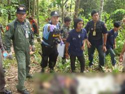 2 เจ้าหน้าที่กำลังชันสูตรพลิกศพสองแม่ลูกที่ถูกฆ่าโหดคาสวนยางพารา