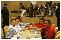 บรรยายภาพ : การจับมือกันระหว่างแกนนำรัฐบาลกับแกนนำคนเสื้อแดง ก่อนเปิดการเจรจาที่สถาบันพระปกเกล้า กรุงเทพฯ