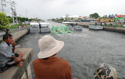 ส่วนพื้นที่ฝั่งตะวันตก ระบายน้ำผ่านประตูน้ำคลองทวีวัฒนา คลองภาษีเจริญ คลองพระยาราชมนตรีเข้าสู่พื้นที่แก้มลิงสนามชัยและลงสู่อ่าวไทย และประสานกรมชลประทานเร่งระบายน้ำผ่านสถานีสูบน้ำจุฬาลงกรณ์ออกสู่แม่น้ำ เจ้าพระยา สถานีสูบน้ำกระทุ่มแบนออกสู่แม่น้ำท่าจีน สถานีสูบน้ำคลองหกวาสายล่าง สถานีสูบน้ำคลองแสนแสบและสถานีสูบน้ำคลองประเวศน์ เพื่อระบายน้ำสู่คลองพระองค์เจ้าไชยานุชิต สู่สถานีสูบน้ำชลหารพิจิตร (คลองด่าน) ลงสู่อ่าวไทย