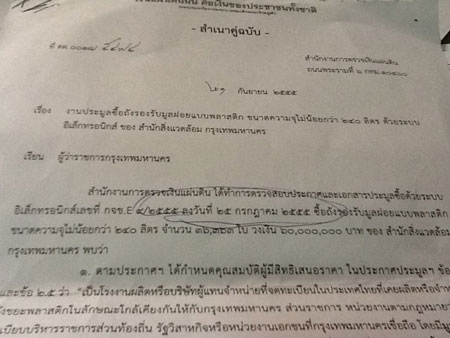 ผู้สื่อข่าวสำนักข่าวอิศรา www.isranews.org ตรวจสอบพบว่า เมื่อวันที่ 21 กันยายน 2555 สตง.ได้ทำหนังสือเลขที่ ตผ 0018/5474 แจ้งถึงผู้ว่าฯ กทม. โดยระบุว่า สตง.ได้ทำการตรวจสอบประกาศและเอกสารประมูลจัดซื้อด้วยระบบอิเล็กทรอนิกส์เลขที่ กจข.E 9/2555 ลงวันที่ 25 กรกฎาคม 2555 ซื้อถังรองรับมูลฝอยแบบพลาสติกขนาดความจุไม่น้อยกว่า 240 ลิตร จำนวน 36,363 ใบ วงเงิน 60 ล้านบาท ของสำนักสิ่งแวดล้อม กรุงเทพมหานคร พบว่า ตามประกาศฯ ได้กำหนดคุณสมบัติผู้มีสิทธิเสนอราคา ในประกาศประมูลฯ ข้อ 5 และข้อ 2.5 ว่า “เป็นโรงงานผลิตหรือบริษัทผู้แทนจำหน่ายที่จดทะเบียนในประเทศที่เคยผลิตหรือจำหน่ายถังขยะพลาสติกในลักษณะใกล้เคียงกันให้กรุงเทพมหานคร ส่วนราชการ หน่วยงานตามกฎหมายว่าด้วยระเบียบบริหารราชการส่วนท้องถิ่น รัฐวิสาหกิจหรือหน่วยงานเอกชนที่กรุงเทพมหานครเชื่อถือ โดยมีมูลค่างานภายในระยะเวลา 7 ปี (สัญญาเดียว) ไม่ต่ำกว่า 18,000,000 บาท”