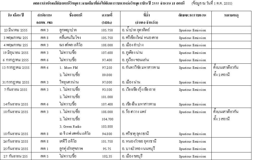 10.ไม่ทราบชื่อ 101.0 อ.เวียงเชียงรุ้ง จ.เชียงราย 11.ไม่ทราบชื่อ 107.4 อ.เชียงยืน จ.มหาสารคาม 12.ไม่ทราบชื่อ 108.0 อ.ร้องกวาง จ.แพร่ 13.ไม่ทราบชื่อ 104.7 อ.ร้องกวาง จ.แพร่ 14.Green Radio 103.8 อ.ร้องกวาง จ.แพร่ 15.เอ จี เวฟ สเตชั่น เรดิโอ 94.8 อ.ศรีธาตุ จ.อุดรธานี 16.เคทีวี เรดิโอ 101.75 อ.หนองวัวซอ จ.อุดรธานี 17.ลูกทุ่งรักสุขภาพ 95.75 อ.บางบัวทอง จ.นนทบุรี และ18.ไม่ทราบชื่อ 102.35 อ.เมือง จ.ชลบุรี.