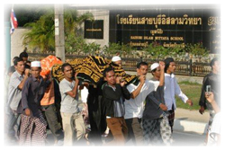 บรรยายภาพ : ชาวบ้านช่วยกันแห่ศพ นายอับดุลการิม ยูโซ๊ะ อิหม่ามประจำมัสยิดบ้านกาหยี อ.สายบุรี จ.ปัตตานี ที่ถูกยิงเสียชีวิตเมื่อวันที่ 30 ม.ค.2552 ไปทำพิธีฝังที่สุสาน ซึ่งเป็นอีกหนึ่ง "เหตุร้ายอธิบายยาก" ในพื้นที่ อ.สายบุรี
