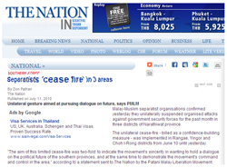 บรรยายภาพ : หน้าเว็บไซต์เนชั่นมัลติมีเดียดอทคอม ที่รายงานข่าว "กลุ่มแบ่งแยกดินแดนประกาศหยุดยิงในพื้นที่ 3 อำเภอ" เมื่อวันที่ 11 ก.ค.ที่ผ่านมา