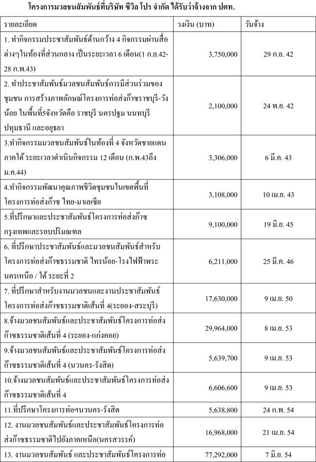 พบว่าเป็นการว่าจ้างทำประชาสัมพันธ์การมีส่วนร่วมของประชาชนต่อการดำเนินโครงการท่อส่งก๊าซของ ปตท.หลายโครงการการ ได้แก่ โครงการท่อส่งก๊าซราชบุรี-วังน้อย ในพื้นที่5จังหวัดคือ ราชบุรี นครปฐม นนทบุรีปทุมธานี และอยุธยา ทำกิจกรรมมวลชนสัมพันธ์ในท้องที่ 4 จังหวัดชายแดนภาคใต้ โครงการพัฒนาคุณภาพชีวิตชุมชนในเขตพื้นที่โครงการท่อส่งก๊าซ ไทย-มาเลเซีย โครงการท่อส่งก๊าซกรุงเทพและรอบปริมณฑล ประชาสัมพันธ์และมวลชนสัมพันธ์สำหรับโครงการท่อส่งก๊าซธรรมชาติ ไทรน้อย-โรงไฟฟ้าพระนครเหนือ / ใต้ ระยะที่ 2 มวลชนและงานประชาสัมพันธ์โครงการท่อส่งก๊าซธรรมชาติเส้นที่ 4(ระยอง-สระบุรี)สัมพันธ์และประชาสัมพันธ์โครงการท่อส่งก๊าซธรรมชาติเส้นที่ 4 (นวนคร-รังสิต) งานมวลชนสัมพันธ์และประชาสัมพันธ์โครงการท่อส่งก๊าซธรรมชาติไปยังภาคเหนือ(นครสวรรค์)