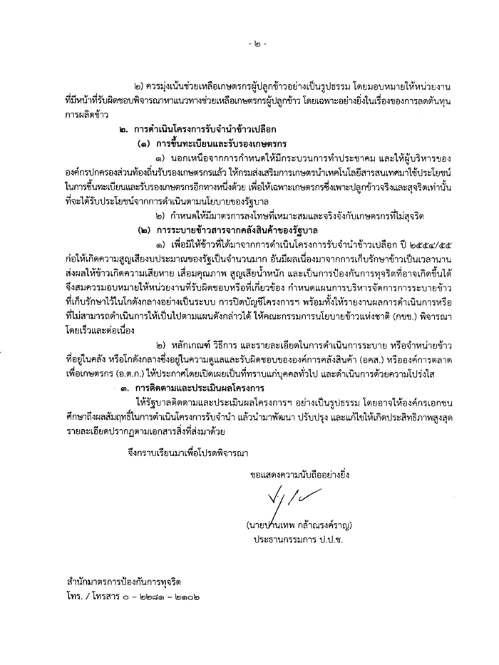 ส่วนการดำเนินโครงการรับจำนำข้าวเปลือก ป.ป.ช. เห็นว่า ในขั้นตอนการขึ้นทะเบียน และรับรองเกษตรกร นอกเหนือจากการทำประชาคม และให้ผู้บริหารองค์กรปกครองส่วนท้องถิ่นรับรองเกษตรกรแล้ว กรมส่งเสริมการเกษตรในฐานะหน่วยงานที่รับผิดชอบเรื่องนี้ ต้องนำเทคโนโลยีสารสนเทศมาใช้ประโยชน์ ในการขึ้นทะเบียนและรับรองเกษตรกรอีกทางหนึ่งด้วย เพื่อให้เฉพาะเกษตรกรที่ปลูกข้าวจริงและสุจริตเท่านั้น ที่จะได้รับประโยชน์จากการดำเนินการตามนโยบายรัฐบาล นอกจากนี้ควรกำหนดให้มีมาตรการลงโทษที่เหมาะสมและจริงจังกับเกษตรกรที่ไม่สุจริต