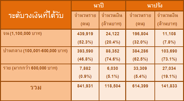 3.เกษตรกรที่ทำนามีประมาณ 4 ล้านครัวเรือน แต่การรับจำนำข้าวปี 2554/2555 มีเกษตรกรนำข้าวมาจำนำประมาณ 1 ล้านราย อีก 3 ล้านราย จะเป็นชาวนาที่จน มีที่นาไม่มาก ไม่สามารถมีผลผลิตมาจำนำได้ รายได้เพิ่มขึ้นจากการรับจำนำ จึงตกอยู่กับชาวนารวย ซึ่งมีที่นามาก หรือนายทุนที่มีที่นาให้เช่าเท่านั้น โดยมีตัวเลขเม็ดเงินเข้าถึงเกษตรกรเพียง 37% ที่เหลือเป็นประโยชน์ต่อนายทุน โรงสีและผู้มีสายสัมพันธ์อันดีกับนักการเมือง