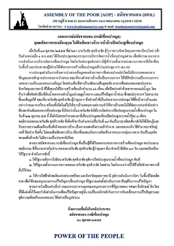 แถลงการณ์สมัชชาคนจน กรณีเขื่อนปากมูล