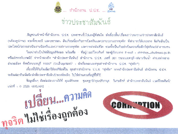 เรื่องที่ได้รับคัดเลือกให้ลงตีพิมพ์ใน จุลสารสำนักงาน ป.ป.ช. "สุจริต" ทางสำนักงานประชาสัมพันธ์ สำนักงาน ป.ป.ช. จะติดต่อกลับเพื่อจัดส่งสื่อประชาสัมพันธ์/ของที่ระลึก ไปให้ท่านตามที่อยู่ที่ให้ไว้