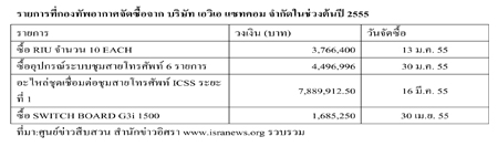 ผู้สื่อข่าวรายงานว่า นับตั้งแต่ วันที่ 13 ม.ค. 2555 -30 เม.ย. 2555 บริษัท เอวิเอ แซทคอม จำกัด ได้รับการจัดซื้อจากวัสดุอุปกรณ์กับกรมสื่อสารอิเล็กทรอนิกส์ทหารอากาศ กองทัพอากาศ รวม 4 รายการ วงเงินรวม 17,838,559 บาท
