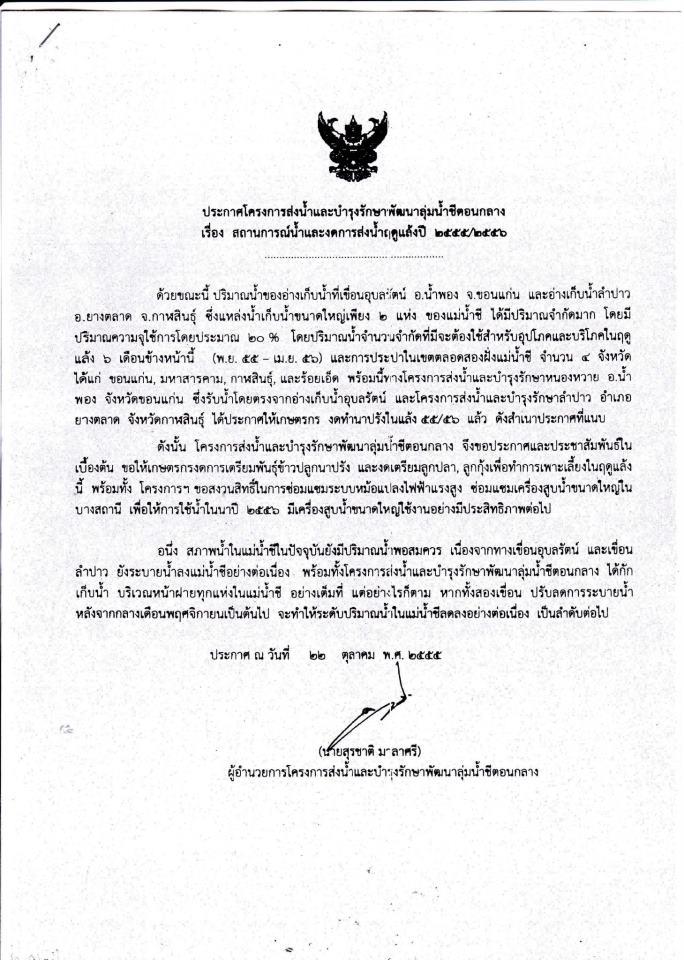 โครงการส่งน้ำและบำรุงรักษาพัฒนาลุ่มน้ำชี ตอนกลางประชาสัมพันธ์ขอให้เกษตรกรงดการเตรียมพันธุ์ข้าวปลูกนาปรัง และงดเตรียมลูกปลา ลูกกุ้ง เพื่อทำการเพาะเลี้ยงในฤดูแล้ง เนื่องจากปริมาณน้ำในอ่างเก็บน้ำเขื่อนอุบลรัตน์ จ.ขอนแก่น และอ่างเก็บน้ำลำปาว จ.กาฬสินธุ์ ซึ่งเป็นแหล่งน้ำต้นทุนมีปริมาณจำกัดมาก ต้องสงวนไว้ใช้สำหรับการอุปโภค บริโภคในฤดูแล้งที่จะมาถึงนี้ (พ.ย. 55-เม.ย.56)