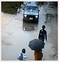บรรยายภาพ : ภาพจากกล้องโทรทัศน์วงจรปิดในวินาทีก่อนคนร้ายจากรถกระบะจะลั่นไกยิงทหารชุดคุ้มครองพระ บนถนนในเขตเทศบาลนครยะลา เมื่อวันเสาร์ที่ 18 ธ.ค.ที่ผ่านมา