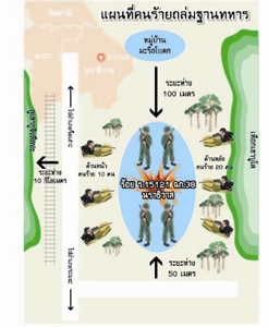 บรรยายภาพ : แผนที่แสดงจุดเกิดเหตุและการเข้าตีฐานทหาร ร้อย ร.15121 ของกลุ่มคนร้าย เมื่อค่ำวันที่ 19 ม.ค.2554