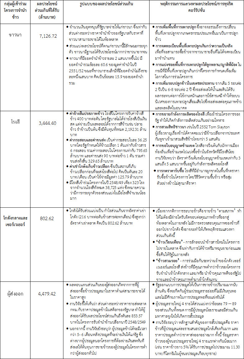 หมายเหตุ: นอกจากส่วนแบ่งผลประโยชน์ส่วนเกินข้างต้นนี้ งานวิจัยยังกล่าวถึงผลประโยชน์ส่วนเกินของนักการเมืองและเจ้าหน้าที่รัฐ ซึ่งได้รับส่วนแบ่งจากผลประโยชน์ส่วนเกินของโรงสี เจ้าของโกดังและผู้ส่งออก แต่งานวิจัยไม่มีข้อมูลเพียงพอในการคำนวณส่วนแบ่งผลประโยชน์ส่วนเกินของกลุ่มบุคคลเหล่านี้