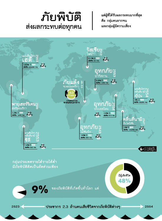 ภัยพิบัติส่งผลกระทบต่อทุกคน แต่ผู้ที่จะได้รับผลกระทบมากที่สุดคือกลุ่มคนยากจนและกลุ่มผู้มีความเสี่ยง อุทกภัยปึ 2555 ส่งผลอย่างไร เมื่อเทียบกับภัยธรรมชาติอื่นๆ ทั่วโลก