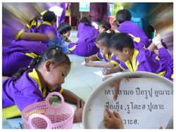 “เด็กๆ มักจะเขียนประโยคที่เขาใช้อยู่เป็นประจำ เช่น เขาจะเขียนคำว่า ‘บาบอ กาเซะ มามี’ แปลว่า ‘พ่อรักแม่’ เขาจะเขียนเป็นภาษาไทย แล้วมาอ่านให้เราฟัง ตรงนี้เป็นตัวชี้วัดที่เห็นเด่นชัด”