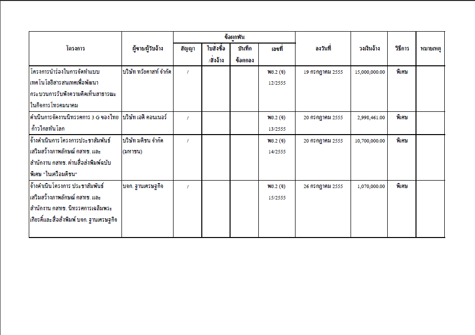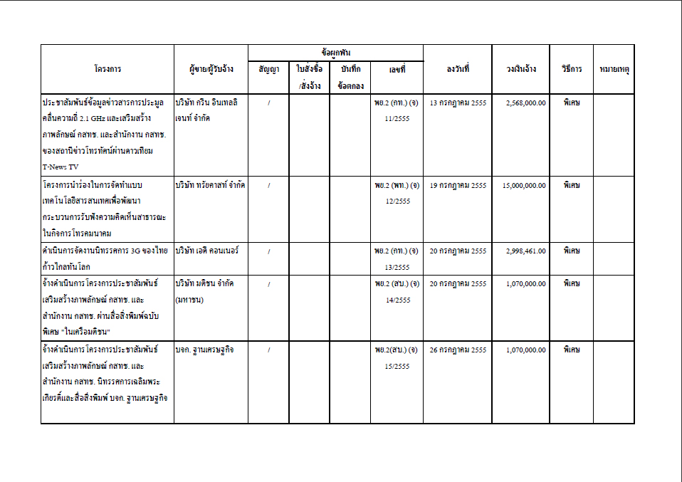 (ด้านล่าง) หน้าเว็บไซต์สำนักงาน กสทช. www.nbtc.go.th ที่นางสุวรรนีย์ เจียรานุชาติ ผู้อำนวยการกลุ่มงานสื่อสารองค์กร สำนักงาน กสทช.ยอมรับว่า สำนักงาน กสทช. “ลงตัวเลขผิด” โดยระบุข้อมูลการจัดซื้อจ้างของบริษัท มติชน จำกัด (มหาชน) ในโครงการ “จ้างดำเนินการโครงการประชาสัมพันธ์เสริมสร้างภาพลักษณ์ กสทช.และสำนักงาน กสทช.ผ่านสื่อสิ่งพิมพ์ฉบับพิเศษในเครือมติชน” ตามข้อผูกพันเลขที่ พย.2 (จ) 15/2555 ลงวันที่ 20 กรกฎาคม พ.ศ.2555 วงเงินจ้าง 10,700,000 บาท ด้วยวิธีพิเศษ