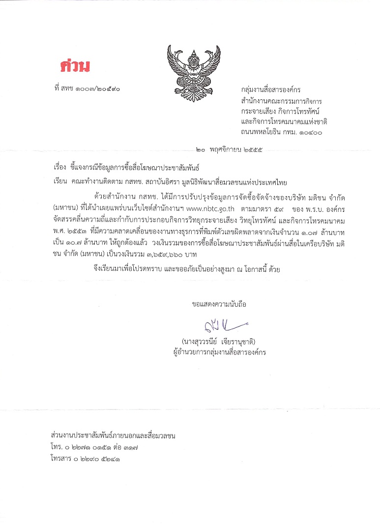 ด้วยสำนักงาน กสทช.ได้มีการปรับปรุงข้อมูลการจัดซื้อจัดจ้างของบริษัท มติชน จำกัด (มหาชน) ที่ได้นำเผยแพร่บนเว็บไซต์สำนักงานฯ www.nbtc.go.th ตามมาตรา 59 ของ พ.ร.บ.องค์กรจัดสรรคลื่นความถี่และกำกับการประกอบกิจการกระจายเสียง วิทยุโทรทัศน์ และกิจการโทรคมนาคม พ.ศ.2553 ที่มีความคลาดเคลื่อนของงานทางธุรการที่พิมพ์ตัวเลขผิดพลาดจากเงินจำนวน 1.07 ล้านบาท เป็น 10.7 ล้านบาท ให้ถูกต้องแล้ว วงเงินรวมของการซื้อสื่อโฆษณาประชาสัมพันธ์ผ่านสื่อในเครือบริษัท มติชน จำกัด (มหาชน) เป็นวงเงินรวม 3,659,660 บาท