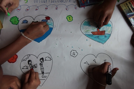 เด็กๆ ที่โรงเรียนสมอคอนวิทยาคาร อ. ท่าวุ้ง จ. ลพบุรีกำลังช่วยกันวาดรูปเพื่อสื่อถึงความรู้สึกของตนที่มีต่อน้ำท่วมครั้งใหญ่เมื่อปีที่แล้ว