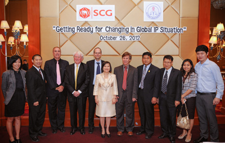 ดร.วิไลพร เจตนจันทร์ (ที่ 6 จากซ้าย) ผู้อำนวยการสำนักงานเทคโนโลยี เอสซีจี นายภัทรศักดิ์ วรรณแสง (ที่ 8 จากซ้าย) อธิบดีผู้พิพากษาศาลทรัพย์สินทางปัญญาและการค้าระหว่างประเทศกลาง และนายศิริศักดิ์ ติยะพรรณ (ที่ 9 จากซ้าย) อธิบดีอัยการสำนักงานคดีทรัพย์สินทางปัญญาและการค้าระหว่างประเทศ ร่วมให้การต้อนรับ Chief Judge Randall R. Rader (ที่ 7 จากซ้าย) หัวหน้าผู้พิพากษาศาลของประเทศสหรัฐอเมริกา Mr. Benjamin J. Hauptman (ที่ 3 จากซ้าย) ผู้เชี่ยวชาญด้านทรัพย์สินทางปัญญาจากประเทศสหรัฐอเมริกา รวมถึง Prof. Dr. Heinz Goddar (ที่ 4 จากซ้าย) และ Dr. Volker Scholz (ที่ 5 จากซ้าย) ผู้เชี่ยวชาญด้านทรัพย์สินทางปัญญาจากประเทศเยอรมนี ในโอกาสร่วมเป็นวิทยากรในงานสัมมนาด้านทรัพย์สินทางปัญญา “Getting Ready for Changing in Global IP Situation” ซึ่งสำนักงานเทคโนโลยี เอสซีจี ร่วมกับหน่วยงานทรัพย์สินทางปัญญา เอสซีจี เคมิคอลส์ และคณะนิติศาสตร์ จุฬาลงกรณมหาวิทยาลัย จัดให้กับกลุ่มนักวิจัย IP Specialists และผู้เกี่ยวข้อง เพื่อเสริมสร้างความรู้ ความเข้าใจเกี่ยวกับสถานการณ์ปัจจุบันของกฎหมายสิทธิบัตรในประเทศสหรัฐอเมริกาและยุโรป เพื่อการบริหารจัดการทรัพย์สินทางปัญญาของไทยให้เกิดประโยชน์สูงสุด