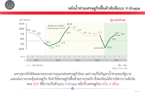 แผนภาพที่ 1 หลังน้ำท่วมเศรษฐกิจฟื้นตัวทันทีแบบ V-Shape พลิกฟื้นได้ภายใน 6 เดือน จากที่จีดีพีไตรมาสสุดท้ายของปี 2554 อยู่ที่ -8.4 เติบโตกลายเป็น +4.4 ได้ภายในไตรมาสที่สองของปี 2555