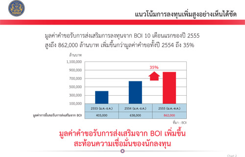 แผนภาพที่ 2 แนวโน้มการลงทุนเพิ่มสูงอย่างเห็นได้ชัด มูลค่าคำขอรับการส่งเสริมการลงทุนจากบีโอไอ 10 เดือนแรกของปี 2555 สูงถึง 862,000 บาท เพิ่มขึ้นกว่ามูลค่าคำขอทั้งปี 2554 ถึง 35%