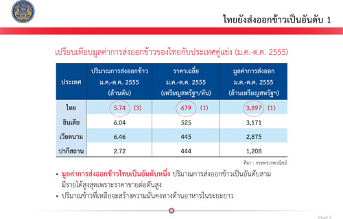 นายกฯ จึงต้องกางแผนภาพที่ 5 แสดงตัวเลขส่งออกข้าวไทยว่า ยังรักษาแชมป์อันดับ 1 ไว้ได้ โดยชี้แจงว่าปริมาณส่งออกข้าว ม.ค–ต.ค.55 ของไทยเป็นอันดับ 3 รองจากเวียดนามและอินเดีย แต่ราคาข้าวเฉลี่ยของไทยอยู่ที่ 679 เหรียญสหรัฐต่อตัน ขณะที่เวียดนามอยู่ที่ 445 เหรียญสหรัฐต่อตัน
