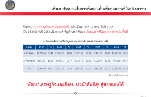 แผนภาพที่ 8 เพิ่มงบประมาณในการพัฒนาเพื่อเพิ่มคุณภาพชีวิตประชาชนในจังหวัดชายแดนภาคใต้ จาก 19.06% ในปี 2554 เป็น 38.54% ในปี 2555