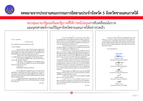 แผนภาพที่ 9 จดหมายขอบคุณนายกรัฐมนตรีและรัฐบาลที่ให้การสนับสนุนการขับเคลื่อนนโยบายและยุทธศาสตร์การแก้ปัญหาจังหวัดชายแดนภาคใต้อย่างรวดเร็ว จากประธานคณะกรรมการอิสลามประจำจังหวัด 5 จังหวัดชายแดนภาคใต้