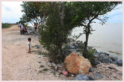 มะกือตา สามะ วัย 32 ปี เจ้าหน้าที่สำนักงานทีทีแอนด์ที สาขาปัตตานี ซึ่งแวะเวียนมาที่ชายหาดไร้ชื่ออยู่เป็นนิตย์ บอกว่า จะมาที่นี่ทุกครั้งที่เบื่อๆ วันไหนนึกขยันหน่อยก็จะเก็บหอยไปฝากที่บ้าน อะไรๆ ก็หาง่าย ทั้งผัก ปลา กุ้ง หอย อยากได้กุ้งก็เอาแหมาทอด อยากกินปลาก็เอาเบ็ดมาตก