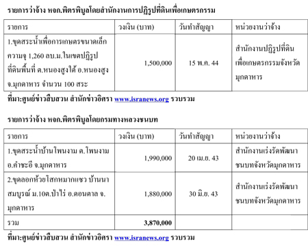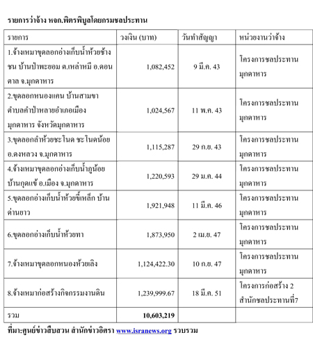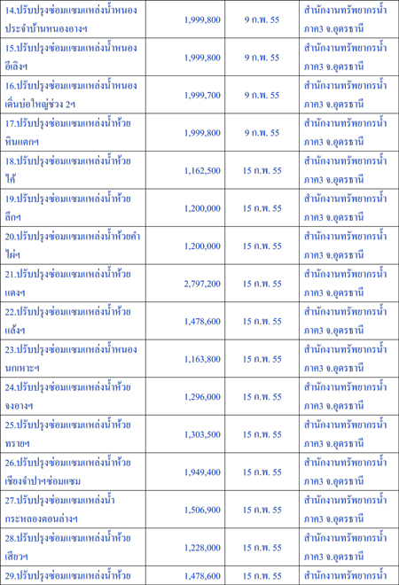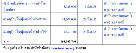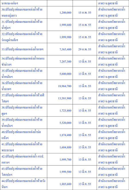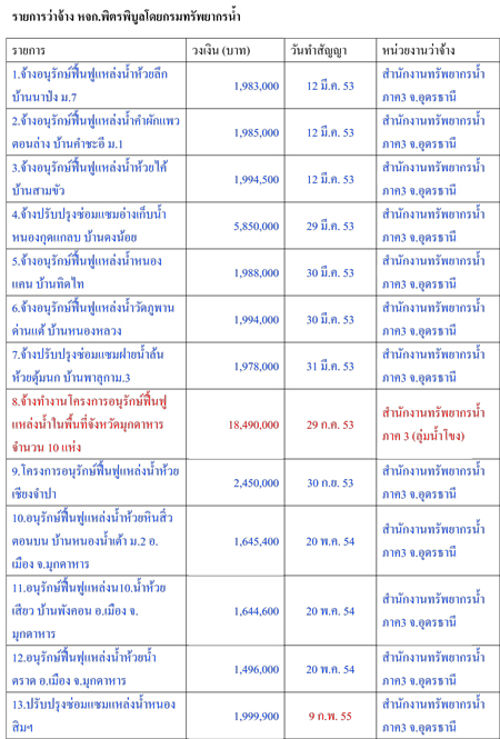 น่าสังเกตว่าในส่วนของกรมทรัพยากรน้ำนั้นเป็นโครงการที่มีการว่าจ้างในช่วงปี 2555 จำนวน 35 โครงการวงเงิน 124,565,240 บาท และเป็นโครงการรับเหมาในพื้นที่สำนักงานทรัพยากรน้ำภาค3 จ.อุดรธานี ทั้งหมด แบ่งเป็นทำสัญญาวันที่ 9 ก.พ. 2555 จำนวน 5 สัญญา วันที่ 15 ก.พ. 2555 จำนวน 15 สัญญา วันที่ 29 ก.พ. 55 1 สัญญา วันที่ 13 มี.ค. 2555 จำนวน 12 สัญญา วันที่ 20 มี.ค. 2555 จำนวน 1 สัญญา และวันที่ 23 มี.ค. 2555 จำนวน 1 สัญญา