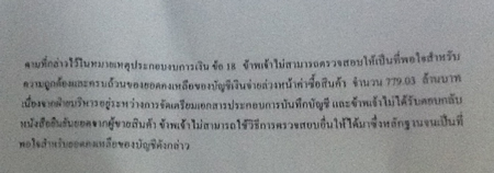 โดยระบุในหมายเหตุ 18 เงินจ่ายล่วงหน้าค่าสินค้า ว่า “ในเดือนธันวาคม 2554 บริษัทฯ ได้เข้าลงนามในสัญญาขายสินค้าให้แก่หน่วยงานของรัฐแห่งหนึ่ง โดยตามเงื่อนไขในสัญญาบริษัทฯ จะต้องจัดส่งสินค้าไปให้แก่หน่วยงานของรัฐแห่งหนึ่งในประเทศอินโดนีเซีย ต่อมาในเดือนธันวาคม 2554 บริษัทฯ ได้จ่ายเงินล่วงหน้าค่าซื้อข้าว เป็นจำนวนเงิน 1,000 ล้านบาท โดยการใช้วงเงินสินเชื่อที่ออกโดยธนาคารพาณิชย์แห่งหนึ่ง เพื่อนำข้าวมาใช้ในการบรรจุและจัดส่งสัญญาดังกล่าวข้างต้น ปัจจุบัน บริษัทอยู่ระหว่างการจัดเตรียมเอกสารหลักฐานสำหรับยอดเงินคงเหลือของบัญชีเงินจ่ายล่วงหน้าค่าซื้อสินค้าดังกล่าว”