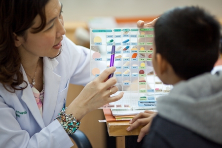 เภสัชกร กำลังอธิบายยาต้านไวรัสชนิดต่างๆ ให้เด็กชายคนหนึ่งที่มีเชื้อเอชไอวี ที่คลินิกการดูแลเด็กที่มีเชื้อเอชไอวีแบบองค์รวม ณ โรงพยาบาลศรีนครินทร์ มหาวิทยาลัยขอนแก่น …