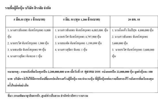 ส่งผลทำให้จำนวนหุ้นในมือผู้ถือหุ้นที่ 4 ราย มีการเปลี่ยนแปลง ตามบัญชีรายชื่อผู้ถือหุ้น ณ วันที่ 5 มิถุนายน 2555 โดยนางสาวธันยพร จันทร์สกุลพร มีจำนวนหุ้นเพิ่มขึ้นเป็น 6,003,000 หุ้น นายสรวิศ จันทร์สกุลพร จำนวนหุ้นเพิ่มขึ้นเป็น 4,797,900 หุ้น นายธนทัต จันทร์สกุลพร จำนวนหุ้นเพิ่มขึ้นเป็น 1,199,099 หุ้น ขณะที่สัดส่วนหุ้นของ นางสาวสุธิดา จันทะเอ ยังเท่าเดิมคือ ถืออยู่ 1 หุ้น
