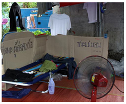 3 เต็นท์พักแรมของผู้ชุมนุมคนเสื้อแดงรายหนึ่งใกล้กับเวทีราชประสงค์ เขียนข้อความประชดประชันเอาไว้ว่า "ที่เฉพาะผู้ก่อการร้าย" (ภาพโดย ปิยะศักดิ์ อู่ทรัพย์)