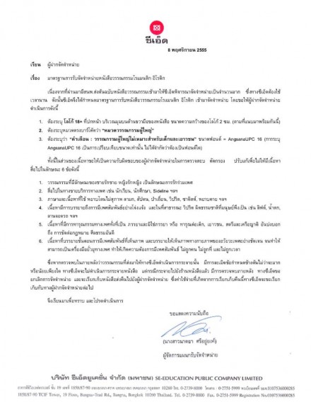 ผู้สื่อข่าวสำนักข่าวอิศรา (www.isranews.org) รายงานว่า ไม่กี่วันที่ผ่านมา ได้มีการเผยแพร่ จดหมายของบริษัท ซีเอ็ดยูเคชั่น จำกัด (มหาชน) ที่ส่งถึงผู้ฝากจัดจำหน่าย เรื่อง “มาตรฐานการรับจัดจำหน่ายหนังสือวรรณกรรมโรแมนติก อิโรติก” ลงวันที่ 8 พ.ย.2555 โดยจดหมายดังกล่าวมีสาระสำคัญคือ บริษัทซีเอ็ดฯได้กำหนดมาตรฐานการรับหนังสือวรรณกรรมโรแมนติก อิโรติก เข้ามาจัดจำหน่าย โดยขอให้ผู้ฝ่ายจัดจำหน่ายดำเนินการ 3 ข้อ ประกอบด้วย 1.ต้องระบุโลโก้ 18+ ที่ปกหน้า 2.ต้องระบุหมวดตรงบาร์โค้ดว่า “หมวดวรรณกรรมผู้ใหญ่” และ 3.ต้องระบุคำเตือนว่าเป็นวรรณกรรมสำหรับผู้ใหญ่ไม่เหมาะสมสำหรับเด็กและเยาวชน”