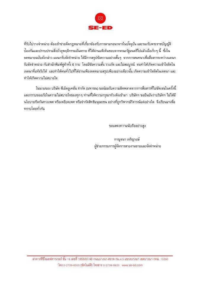 “แต่เนื่องจากจดหมายดังกล่าวมีข้อความสั้น รวบรัด และไม่สมบูรณ์ จนทำให้เกิดความเข้าใจผิดในเจตนาที่แท้จริงได้ บริษัทซีเอ็ดฯขอน้อมรับความผิดพลาดจากการสื่อสารที่ไม่ชัดเจนในครั้งนี้ และกรอบขออภัยในความไม่สบายใจของทุกๆ ท่านที่ให้ความกรุณาท้วงติงเข้ามา ขอยืนยันว่าบริษัทซีเอ็ดฯไม่ได้มีนโยบายกีดกันทางเพศ หรือเหยียดเพศ หรือจำกัดสิทธิมนุษยชน อย่างที่ถูกวิพากษ์วิจารณ์แต่อย่างใด” แถลงการณ์จากบริษัทซีเอ็ดฯที่ลงนามโดยนางกาญจนา เจริญวงษ์ ผู้ช่วยกรรมการผู้จัดการสายงานขายและจัดจำหน่าย บริษัทซีเอ็ดฯ ระบุ