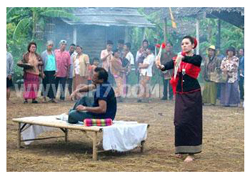 การอัญเชิญ ผีฟ้า-ผีแถน มาเข้าทรงในร่างของตน (‘ผีฟ้า’ สามารถสิงได้ทั้งหญิง ชายและเด็กไม่จำกัดอายุ) เริ่มแรกผู้เข้าทรงมักมีอาการสั่นเทิ้ม มือที่พนมสะบัดอย่างแรงและเร็ว จากนั้นจึงมีการฟ้อนรำและการร้อง ‘ลำ’ ตอบโต้กันระหว่างผีฟ้าเป็นเวลานานทีเดียว ในระหว่างนี้จะมีการบอกวิธีแก้ไขหรือการบำบัดรักษาโรค บางครั้งมีการรำทั้งวันทั้งคืนติดต่อกันหลายวัน การลำผีฟ้ามีทั่วไป ชาวบ้านจะมามุงดูเหมือนดูมหรสพ คล้ายกับการเล่นมะโย่งของชาวมลายูเมื่อ 40-50 ปีที่ผ่านมา โดยมีพื้นฐานความเชื่อร่วมกันว่า การลำผีฟ้าหรือการเล่นมะโย่งจะรักษาผู้ป่วยให้หายได้ รวมทั้งจะก่อให้เกิดความสุขสวัสดีและความเป็นสิริมงคลในชีวิตของผู้นั้น
